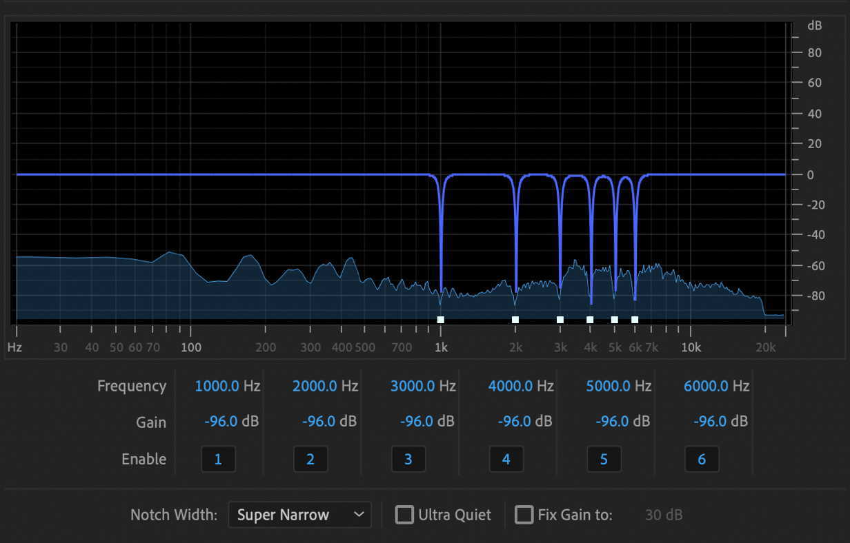 In this case, I identified from the audio's frequency spectrum that the hum had a base frequency of exactly 1khz, with some smaller harmonics, at 2kHz-6kHz. Here is what my finished notch filter looked like: